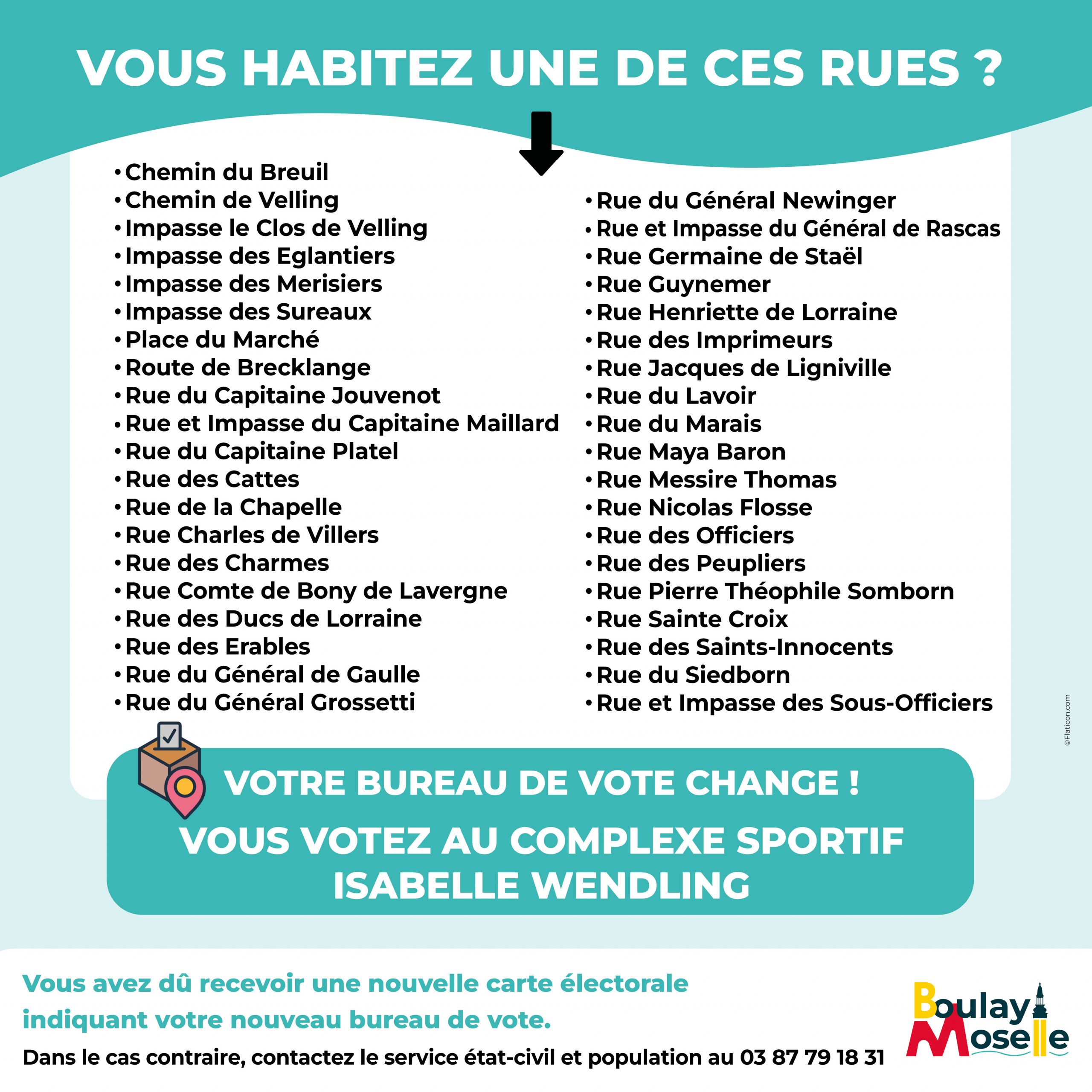Certaines rues ont été associées à un nouveau bureau de vote. Les électeurs concernés ont reçu une nouvelle carte électorale indiquant ce changement en août 2025 et pour certains en février 2026.