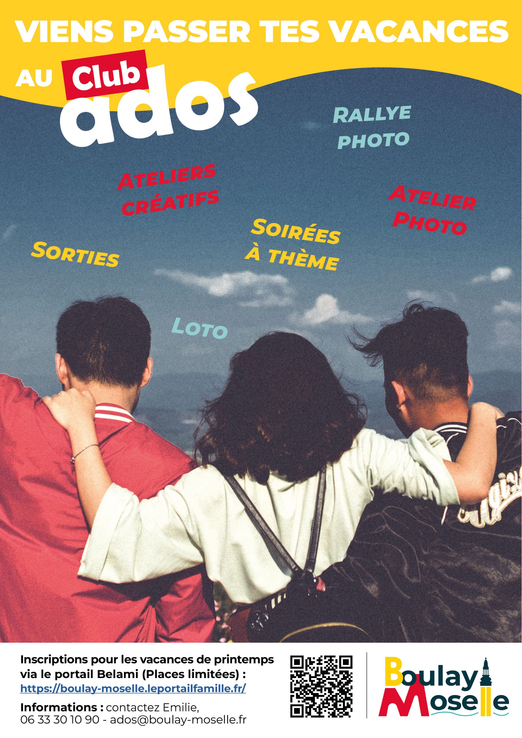 Club Ados – Vacances de printemps Voir l'image agrandie Inscrivez vos enfants au Club Ados via le nouveau portail : https://boulay-moselle.leportailfamille.fr/ Lucie Lentz2026-03-30T16:42:15+02:0030 mars 2026| Partager cet article FacebookLinkedInEmail